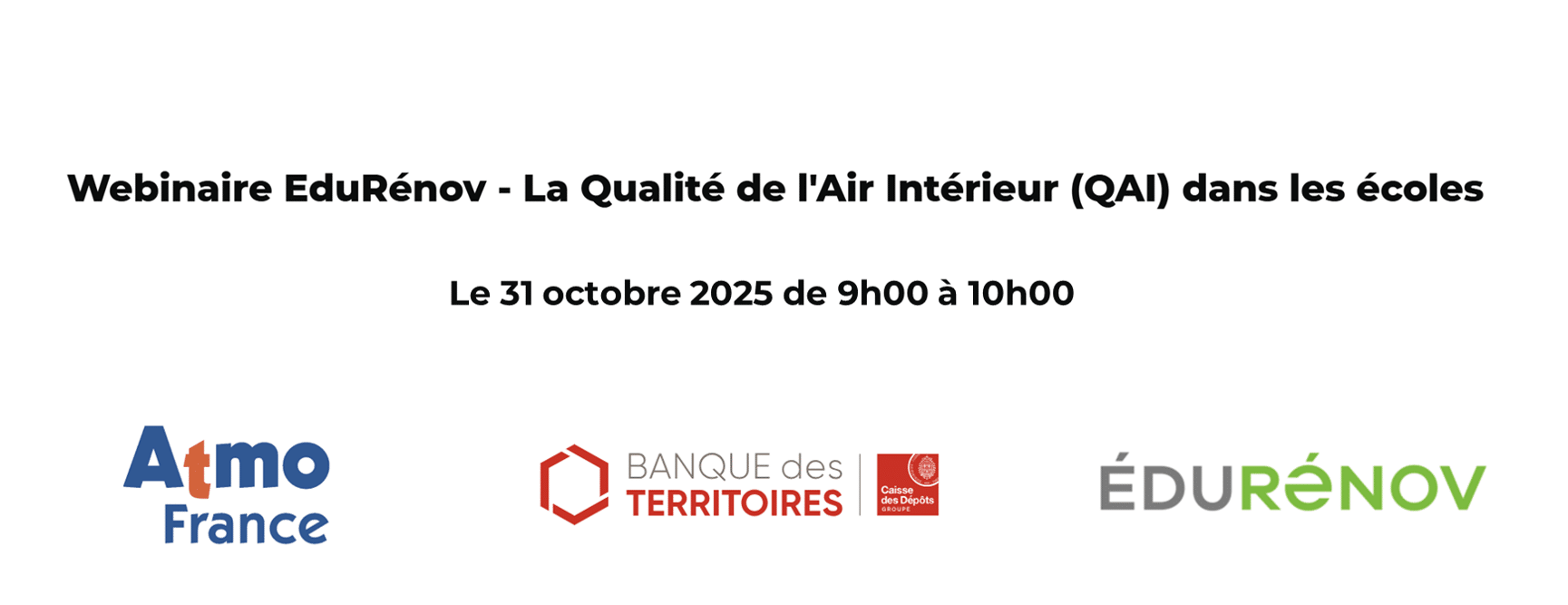 Le 31 octobre 2025, la Banque des Territoires propose un webinaire de 9h à 10h consacré à la qualité de l’air intérieur (QAI) dans les établissements scolaires, dans le cadre du programme EduRénov, destiné à accompagner les collectivités dans leurs projets de rénovation énergétique et de confort des écoles.